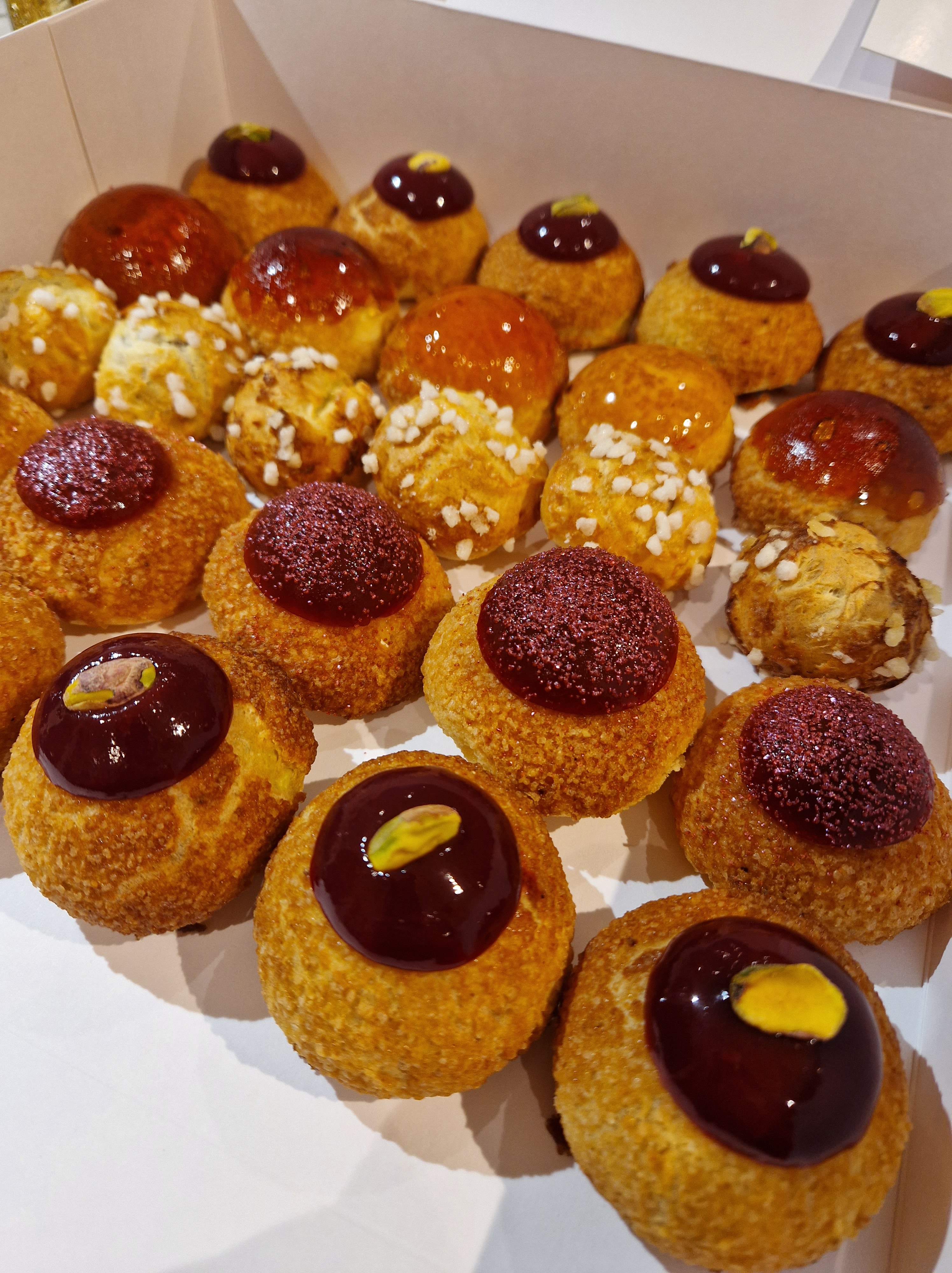 Pistaches : ganache montée pistache, pistaches concassées et coulant pistaches.